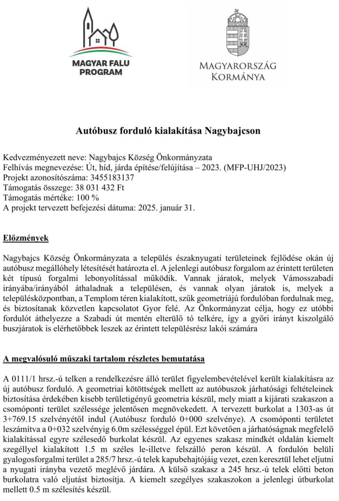 Út, híd, járda építése/felújítása (Autóbuszforduló kialakítása Nagybajcson) – 2023.
